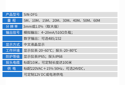 應用行業 SIN-DFG分體式超聲波液位計廣泛用于罐體、水池、水庫的液位和體積測量,也可用于明渠的流量測量。