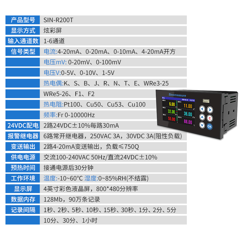 聯測儀表SIN-R200T工業無紙記錄儀,6通道萬能輸入,160*80 面板尺寸。可輸入電流、電壓、熱電偶、熱電阻和頻率等工業信號,以數值、棒和曲線形式實時顯示數據,定時將數據存儲于儀表內部電子存儲器,可通過 USB 設備快速轉存歷史數據。